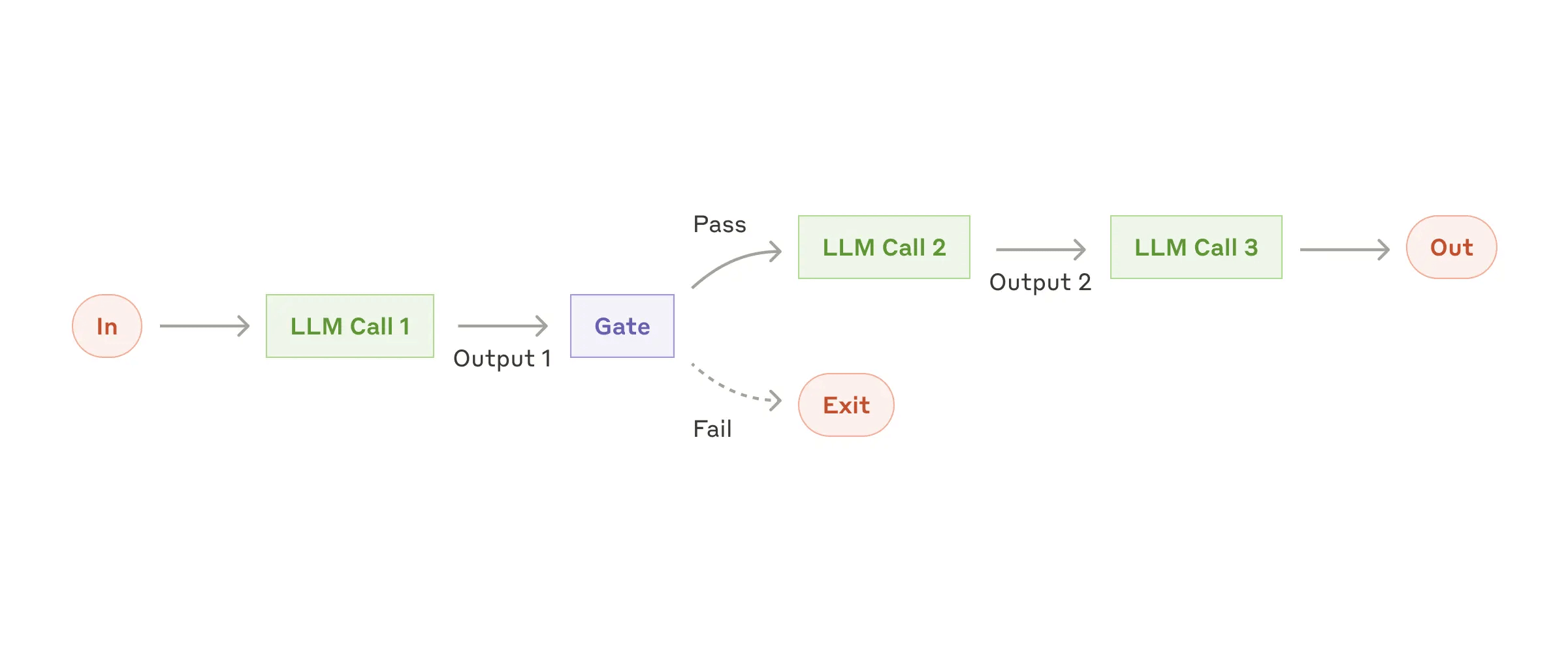 Prompt chaining decomposes a task into a sequence of steps, where each LLM call processes the output of the previous one. You can add programmatic checks (see “gate” in the diagram below) on any intermediate steps to ensure that the process is still on track.Prompt Chaining 就是前一个输出给到下一个输入,串联了多个节点,这多个节点可能同时都请求了大模型,但是可能拥有不同的 Prompt。